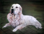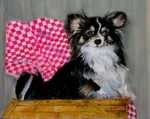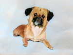 2011Hondje gemaakt in opdracht, naar foto. In pass-partout geplaatst en ingelijst achter glas.